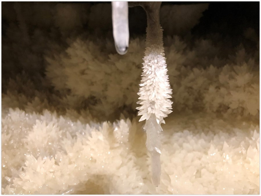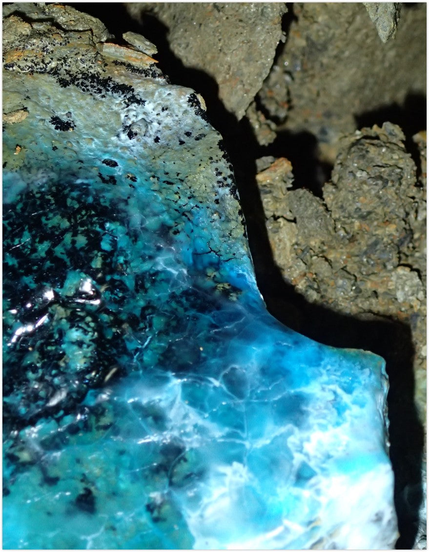 Allophane: Related to copper; it is an amorphous to poorly crystalline hydrous aluminium silicate clay mineraloid. A blue stalagtite dripped this glassy blue sheet on a rock below.